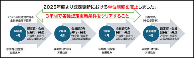 時期・・・全ての資格認定費は年間費と共に毎年度徴収となりますが、更新は3年ごととなり